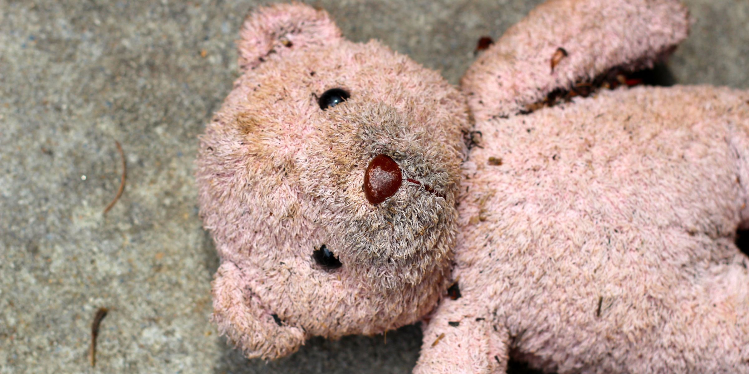 The fur was matted and muddy, one eye was missing, and there was a big rip in its back. It looked like the stuffing was lumpy and dry.