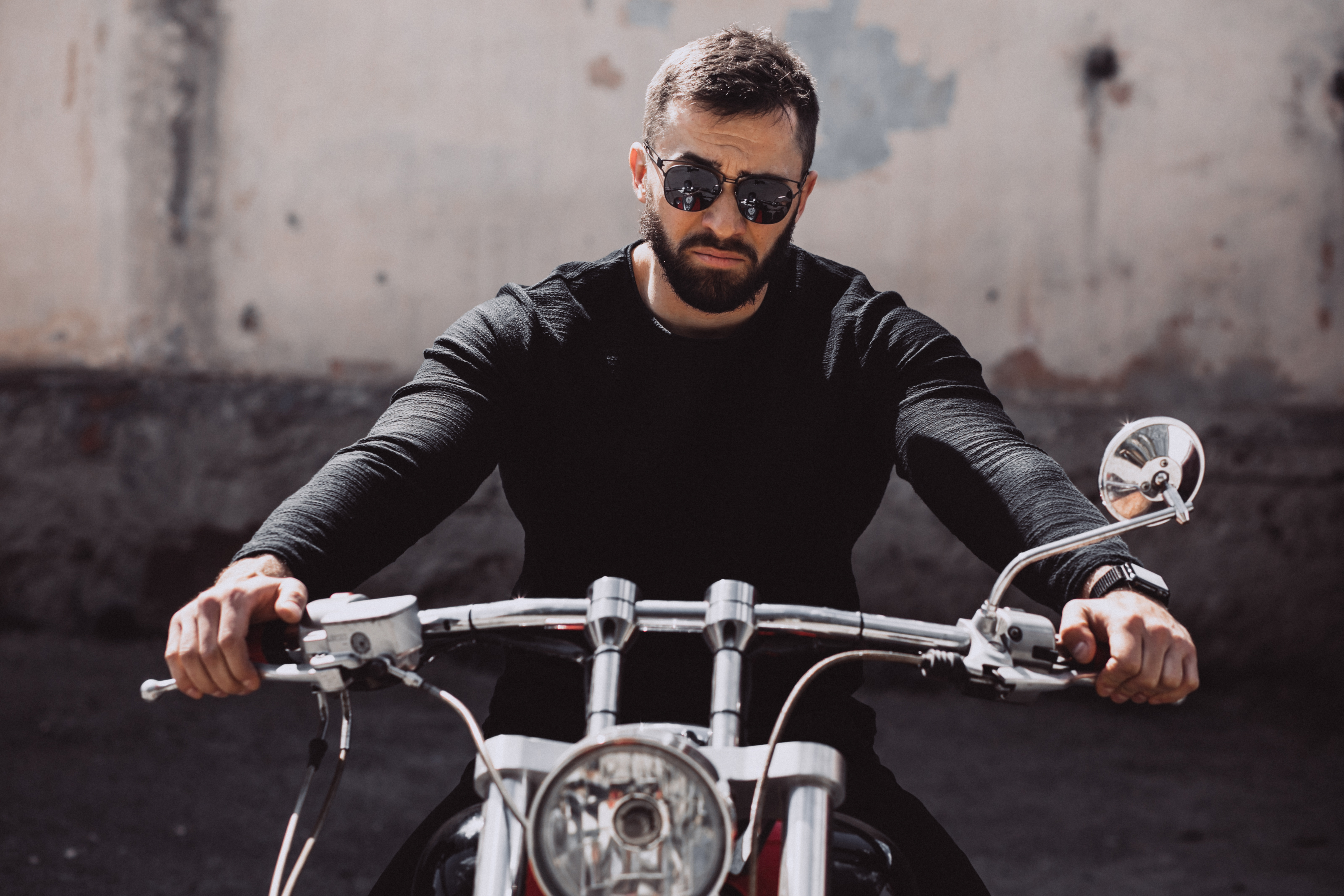 Gray beard. Leather vest. Boots. Tattoos.